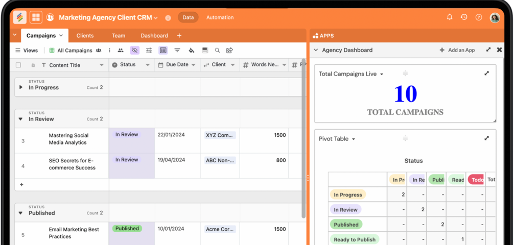Plan campaigns, manage clients, and automate your entire marketing workflow with Stackby. From content calendars to performance tracking — bring your team, data, and AI-powered operations together in one place.