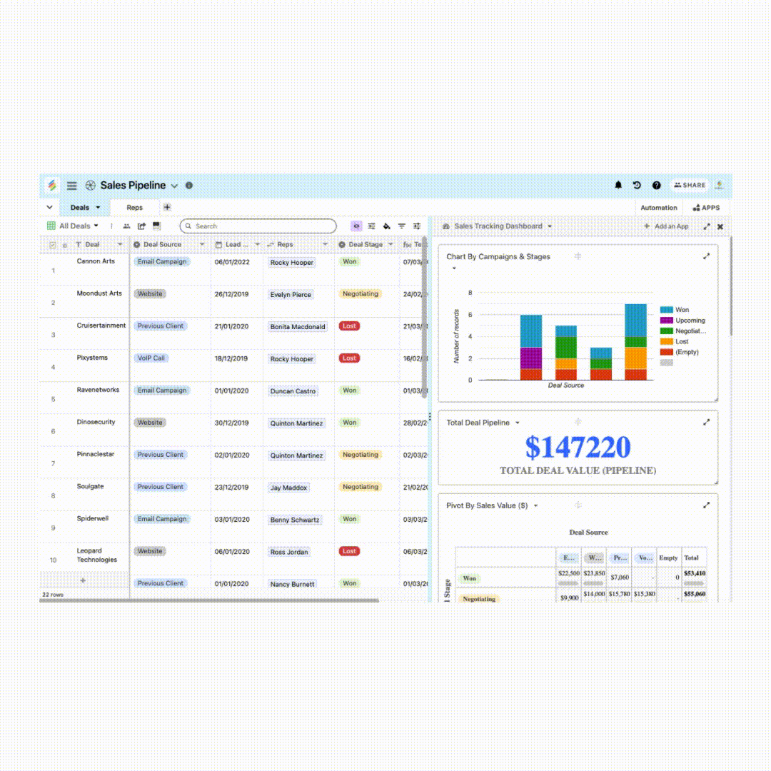 Use Stackby's out the box apps to create your custom reporting dashboard. Analyze and bring real-time insights with custom charts, pivot table, summary bars and more.