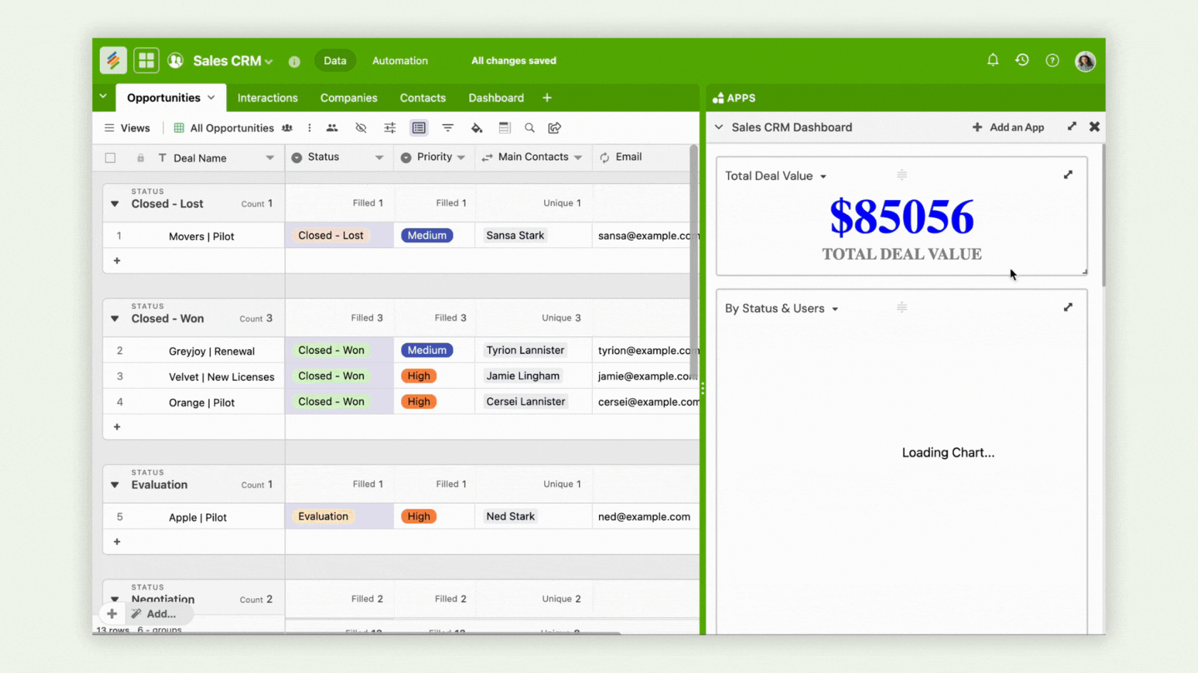 Absolutely. With 30+ unique field types, 8 visualization options, advanced form builder, reporting dashboards, internal automations, and custom activities on records, Stackby gives you everything you need to run a complete Sales CRM. You also get two-way email sync with Gmail and Outlook, so all conversations stay linked to your records.
