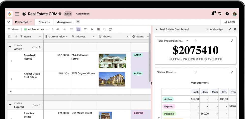 From residential sales to lease management to commercial acquisitions, manage all your data in a single place and visualize in Kanban and Gallery or stay on track with Calendar and collect information via Custom Forms.